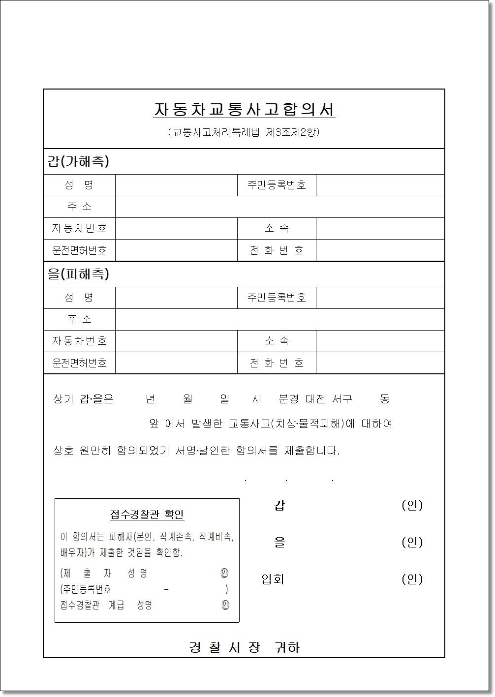 교통사고가 발생한 후 원만한 해결을 위해 합의서를 작성하는 경우가 많습니다. 하지만 단순히 금액만 기재하고 서명하는 식으로 처리하면, 나중에 법적 분쟁이 발생했을 때 불리한 상황에 놓일 수 있습니다. 합의서는 사고를 마무리 짓는 중요한 문서이기 때문에, 반드시 법적 효력이 있도록 꼼꼼하게 작성해야 합니다. 이번 글에서는 교통사고 합의서 작성법과 필수 항목, 공증 여부까지 상세히 안내해 드리겠습니다.