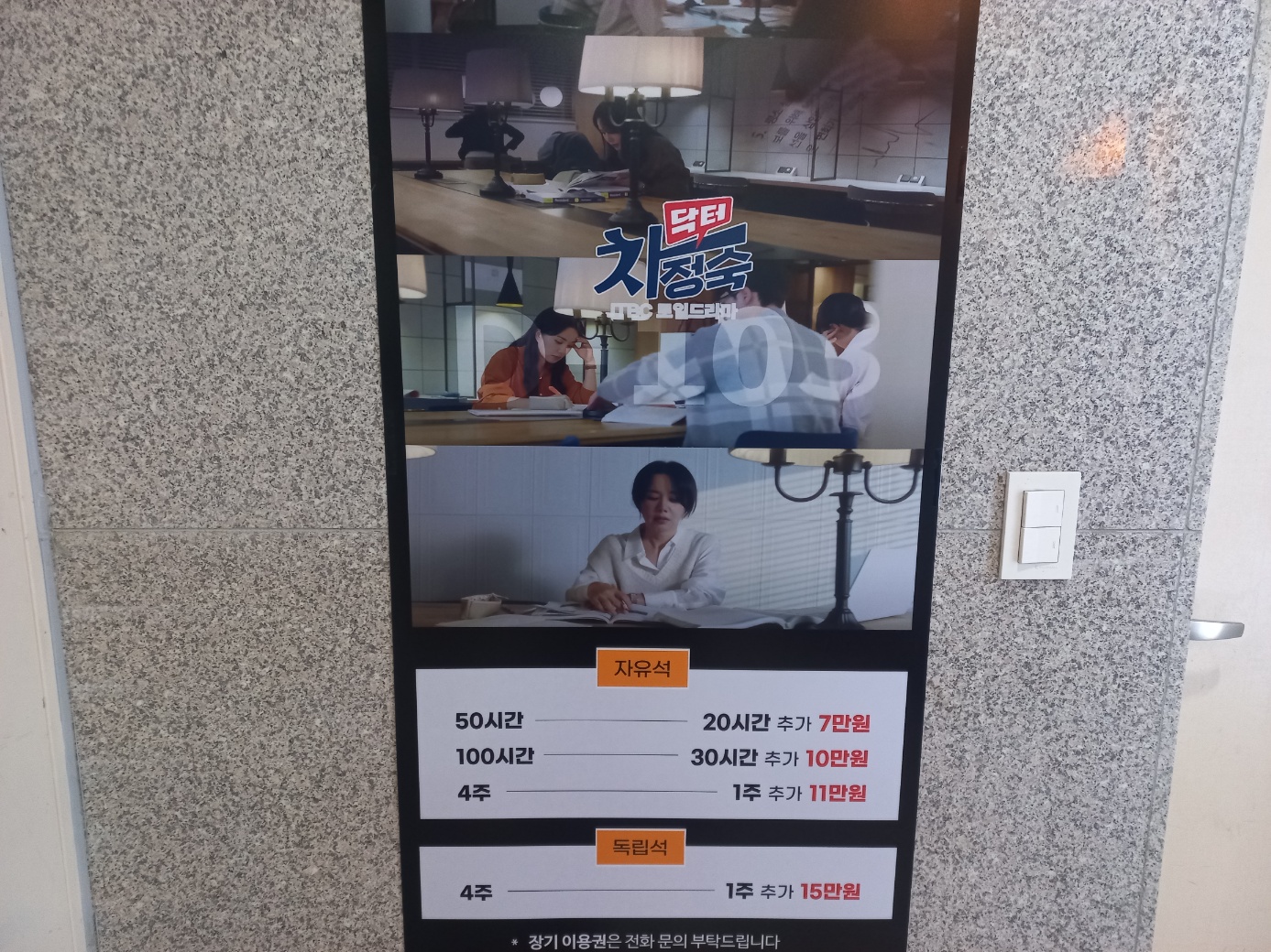 특히 중1,중2, 중3은 사용불가로 고등학생과 성인대상으로 운영을 한다는 안내문(경고문)이 있어서 비록 무인스터디카페 방식이라도 내부가 깨끗하고 조용할 것이라는 것이 충분히 예상이 되네요.