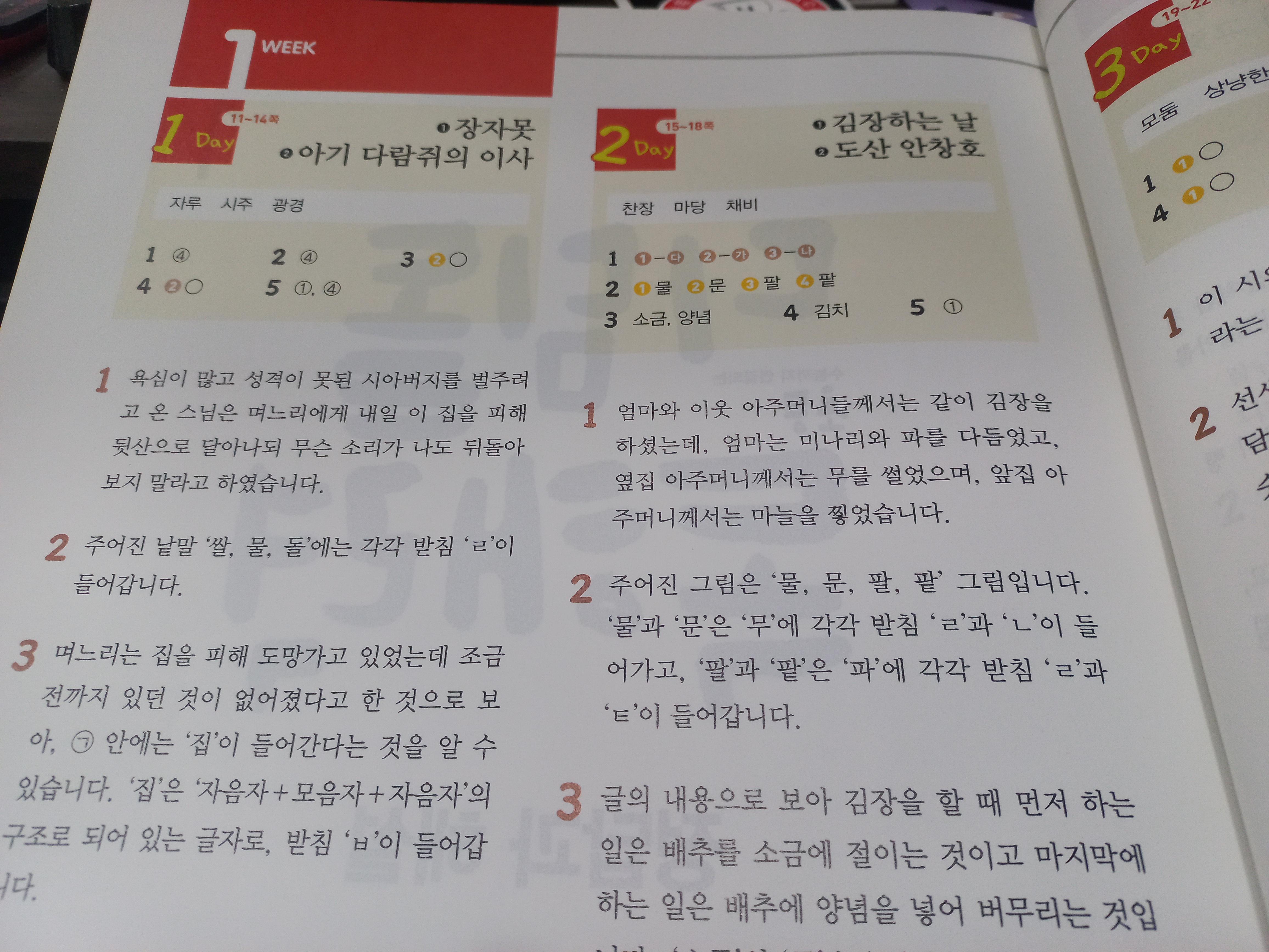 정답과 해설은 문제집과 분리 되어서 편하고 1 WEEK 별 1DAY씩 정답과 해설이 자세히 나와 있어서 채점시 답안을 확인하면서 풀이를 한 번 더 짚어보면 좋습니다.