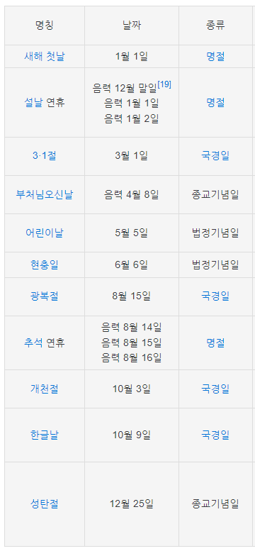 - 대체공휴일: 법정 공휴일이 토요일이나 일요일과 겹치는 경우 다음의 첫 번째 평일을 대체공휴일로 지정