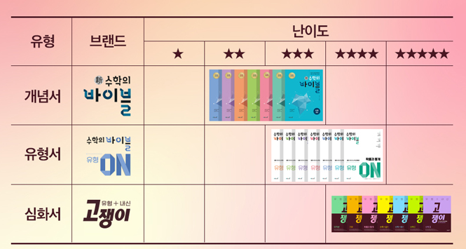 2. 내신대비에 필수라고 일컬을 정도로 유명한 교재이다. 앞장에는 매단원의 간략한 개념정리가 있고,난이도에 따라 분류되어있는 스텝별문제들이 있어서 개념부터 난이도있는 어려운 문제까지 연결고리 역할을 할수있는 구성인것같다.고쟁이는 중등부터 고등까지 구비되어있는데,특히 중등교재에서는 오답에 해당되는문제를 다시풀수있도록 워크북이 별도로 구성되어있어 오답관리까지 매우 유용하게되어있다.