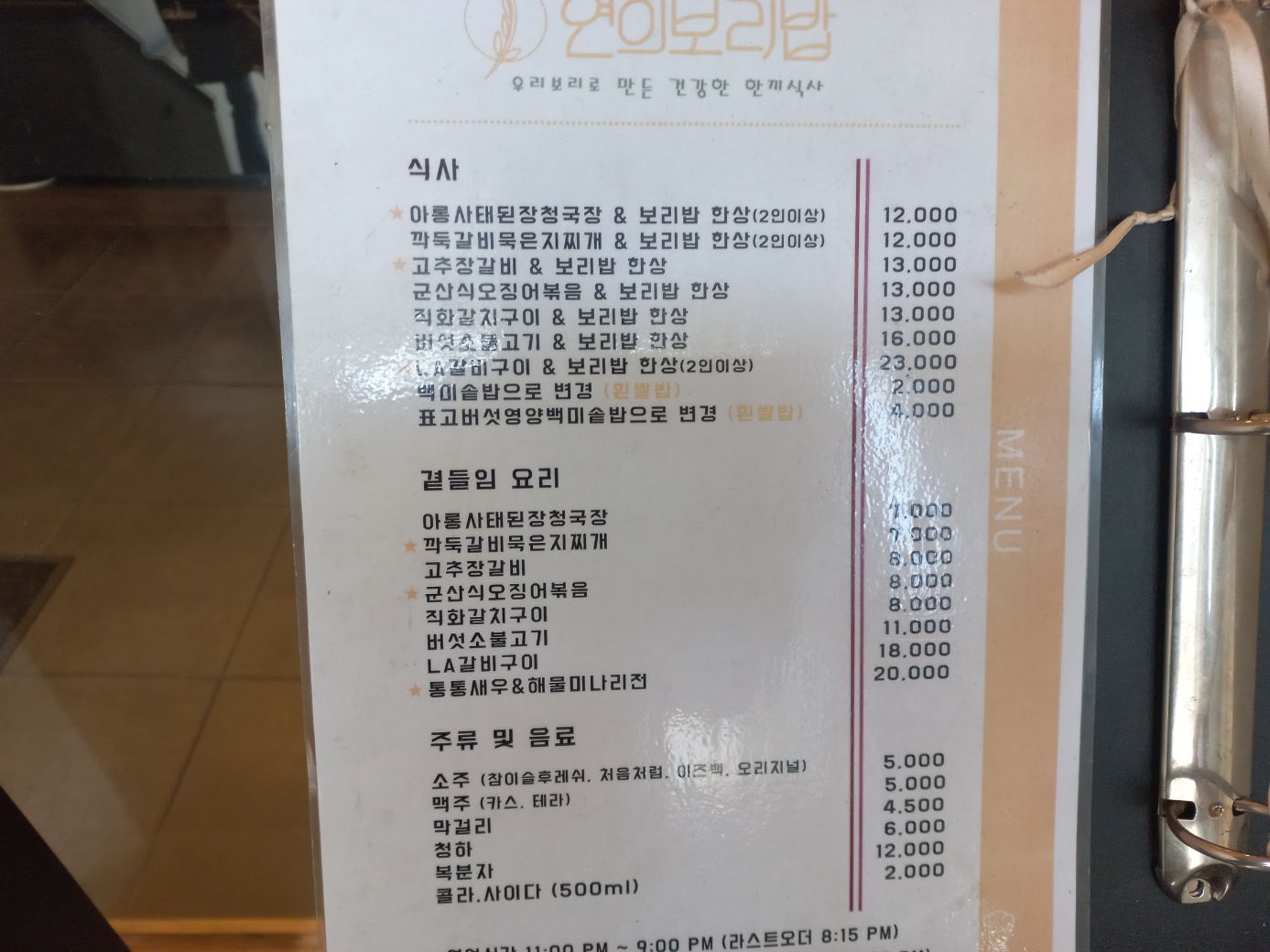 저희는 메뉴판 첫번째 메뉴인 아롱사태된장청국장 & 보리밥 한쌍 (2인)과 직화갈치구이 주문했습니다.