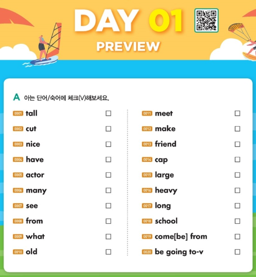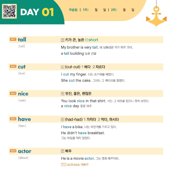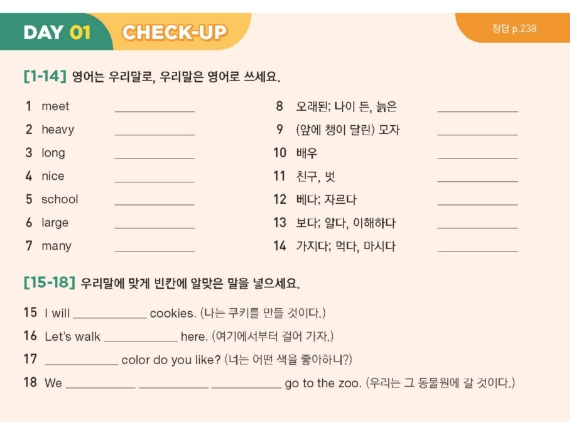 막상 한국말뜻 여러개 말할 수 있나 보면 그렇지 못한 경우도 꽤 되요. 단어는 쉬운데 디테일하게 들어가면 놓친 것도 많이 보여서 이 단계도 꼭 해야한다고 하네요. 전 학원교재로 샀어요. 뒤에 작고 얇게 단어만 정리된 책도 있어서 들고다니면서 수시로 보기도 좋아요.