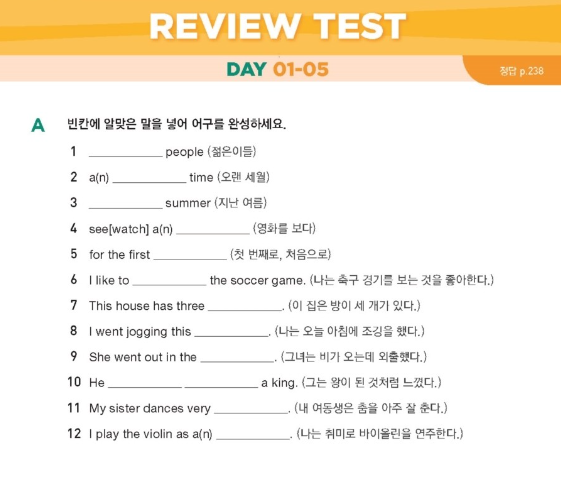 일별로 단어가 나눠져 있어서 한 번에 1~2일치씩 외우기 좋고, 단어별 예문이 수록되어 있어 해당 단어가 실제로 어떻게 쓰이는지도 배울 수 있어 유용합니다. 단어 테스트는 거의 사용하지 않는데, 혼자 공부하는 학생의 경우 단어를 외우고 확인용으로 사용하면 좋을 것 같아요.