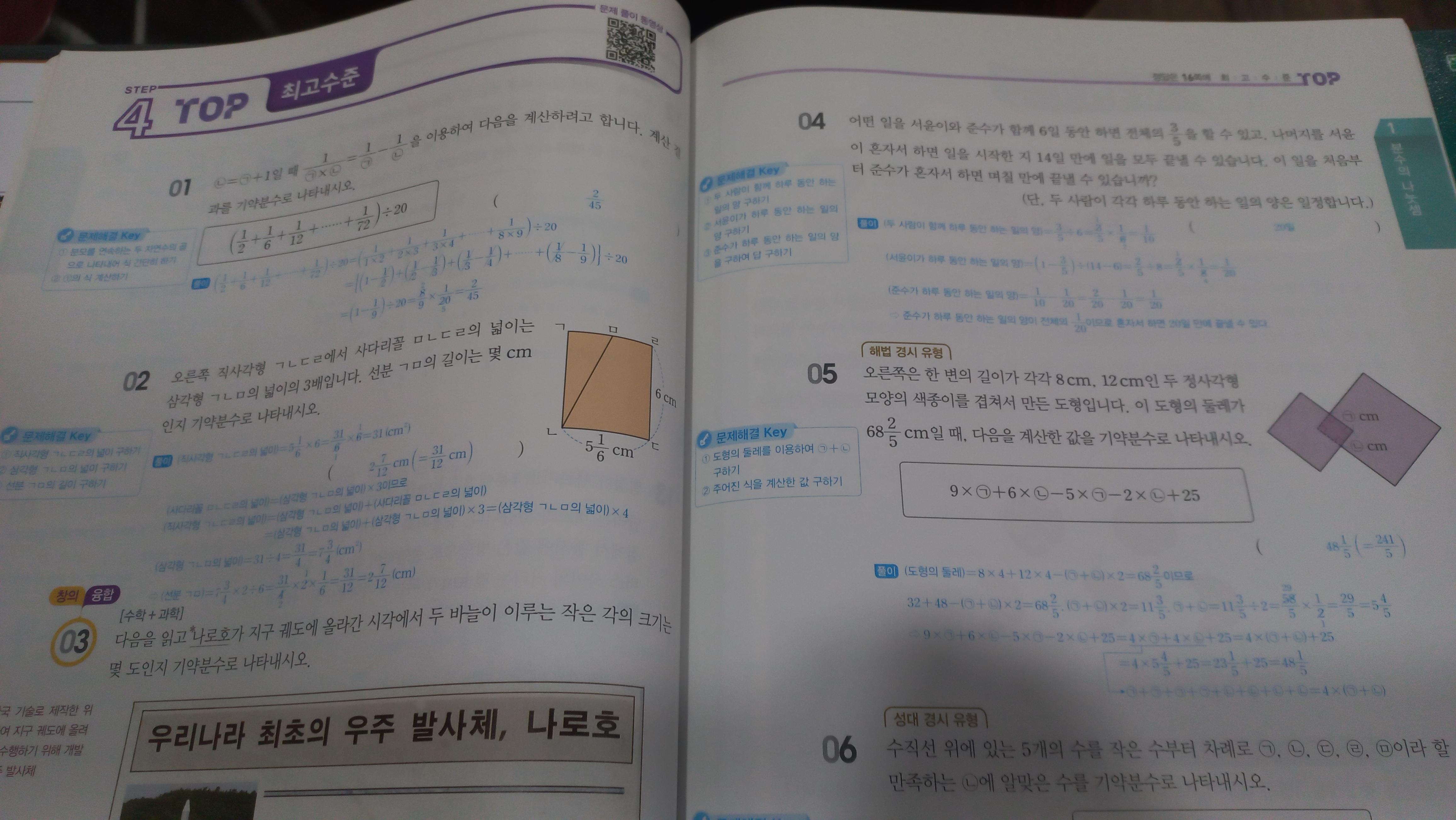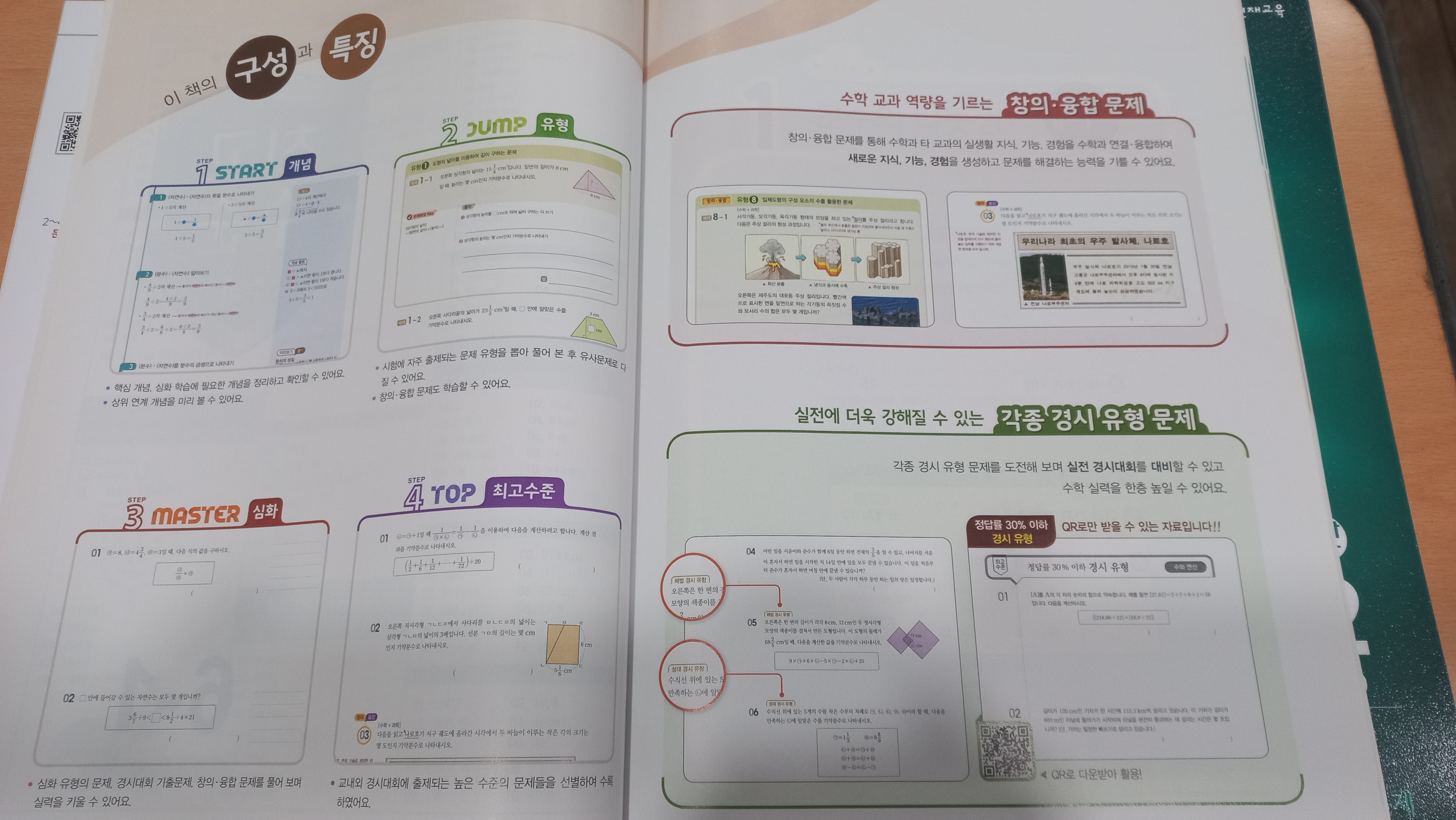전반적으로 최고수준해법수학과 최강TOT는 추구하는 바가 같지만 최고수준해법수학을 그래도 중위권 난이도 문제가 꽤 들어있고 상위권, 최상위권 난이도의 문제 수를 비슷하게 맞춘 반면에 최강TOT 수학교재는 중위권 문제수를 줄이고 상위권과 최상위권 난이도의 문제들로 편집이 되어 있고 윗학년 선행 없어도 풀 수 있도록 난이도가 조정된 느낌이라 위에서 언급한 대로 시험이 어렵게 나오는 학교의 내신만점대비용 교재로 적당하고 굳이 두 권을 다 풀 필요는 없고 학생 수준에 맞게 또는 그냥 맘에 드는 교재디자인을 보고 선택하더라도 워낙 문제가 좋아서 괜찮은 선택이 될 것이라고 생각됩니다