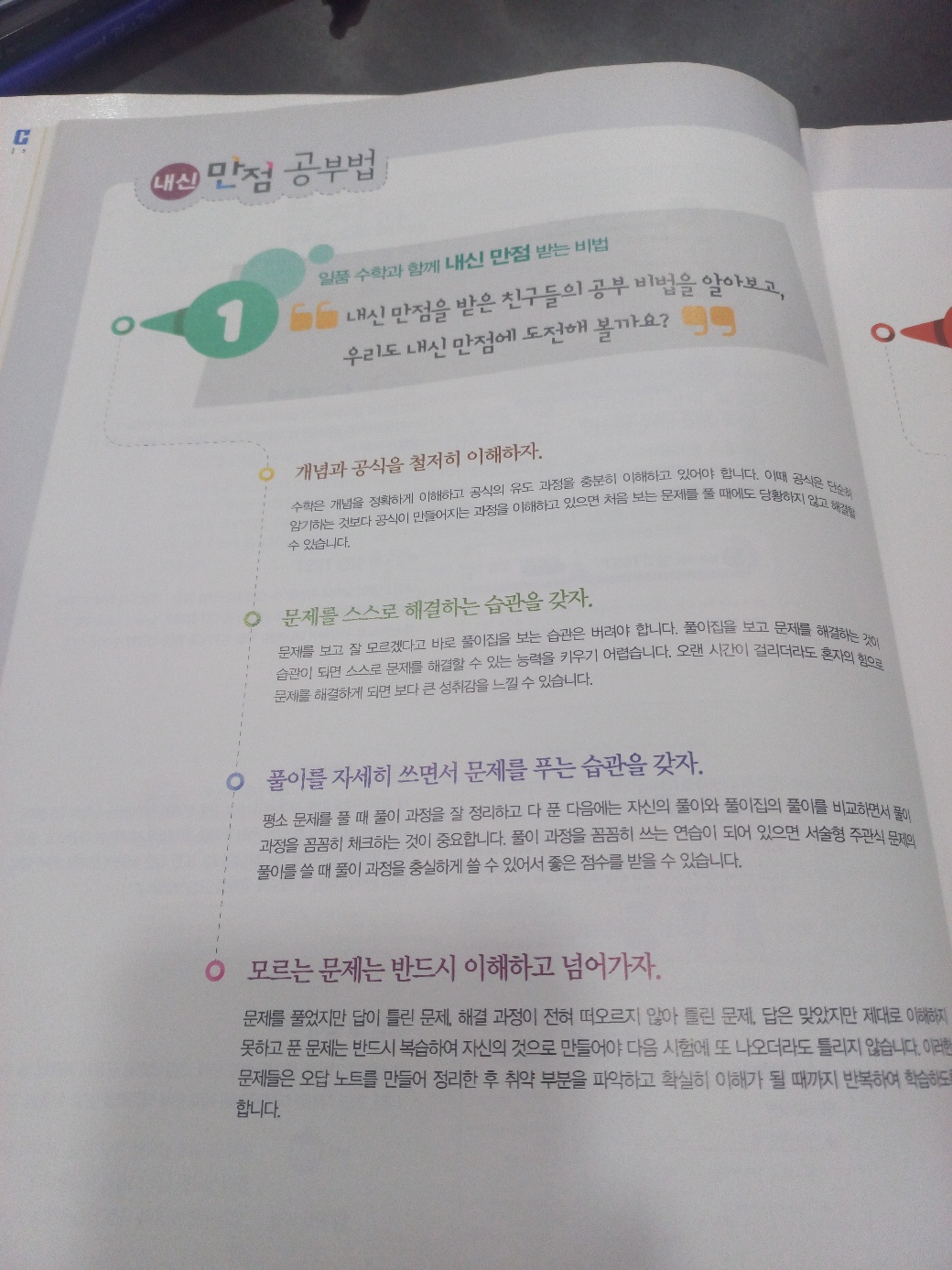 일품수학 즉 심화문제집을 푸는 학생들은 당연히 내신 고득점, 내신 만점을 목표로 할테니 내신 만점 공부법을 소개해주는 것은 아주 좋은 편집이라고 생각됩니다.
