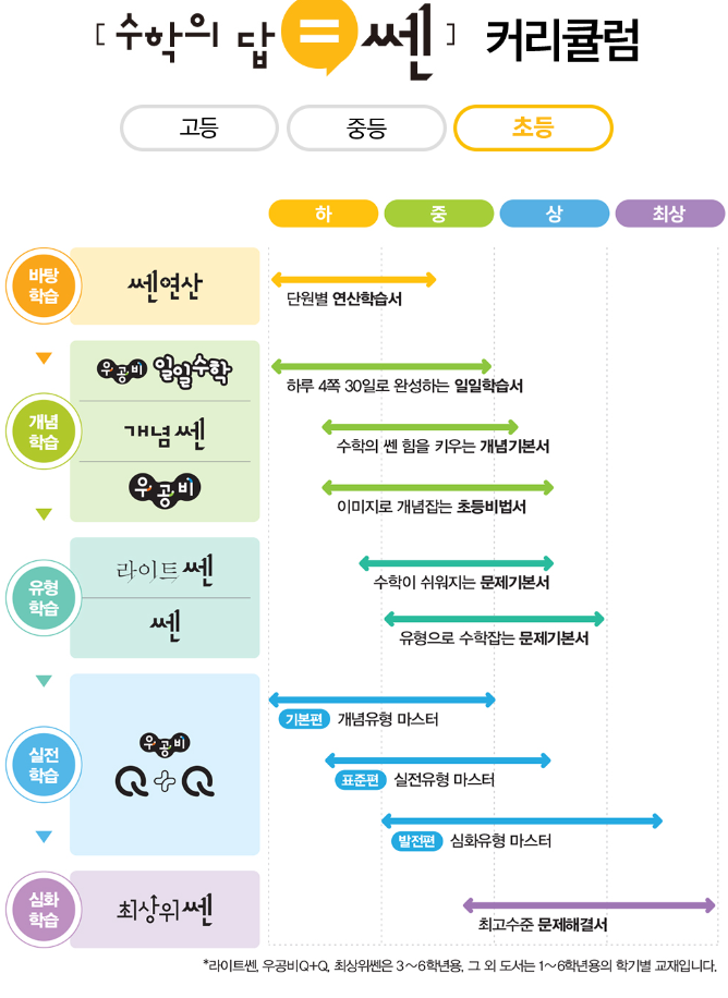 학원을 운영하면서 부모님이나 학생들이 어떤 책을 푸는게 좋을지 물어보는 경우가 많아서 오늘은 초등 쎈수학 시리즈의 각 교재별 특징을 자세히 소개해보는 글을 써 보려고 합니다.