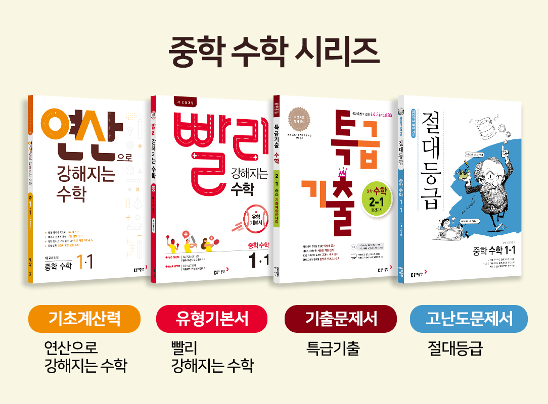 초등수학에 이어 중등수학 역시 기본서를풀고 1:1 매칭되는 워크북으로 진도북의 문제를 한번 더 반복학습을 할수가 있어 좋았습니다.