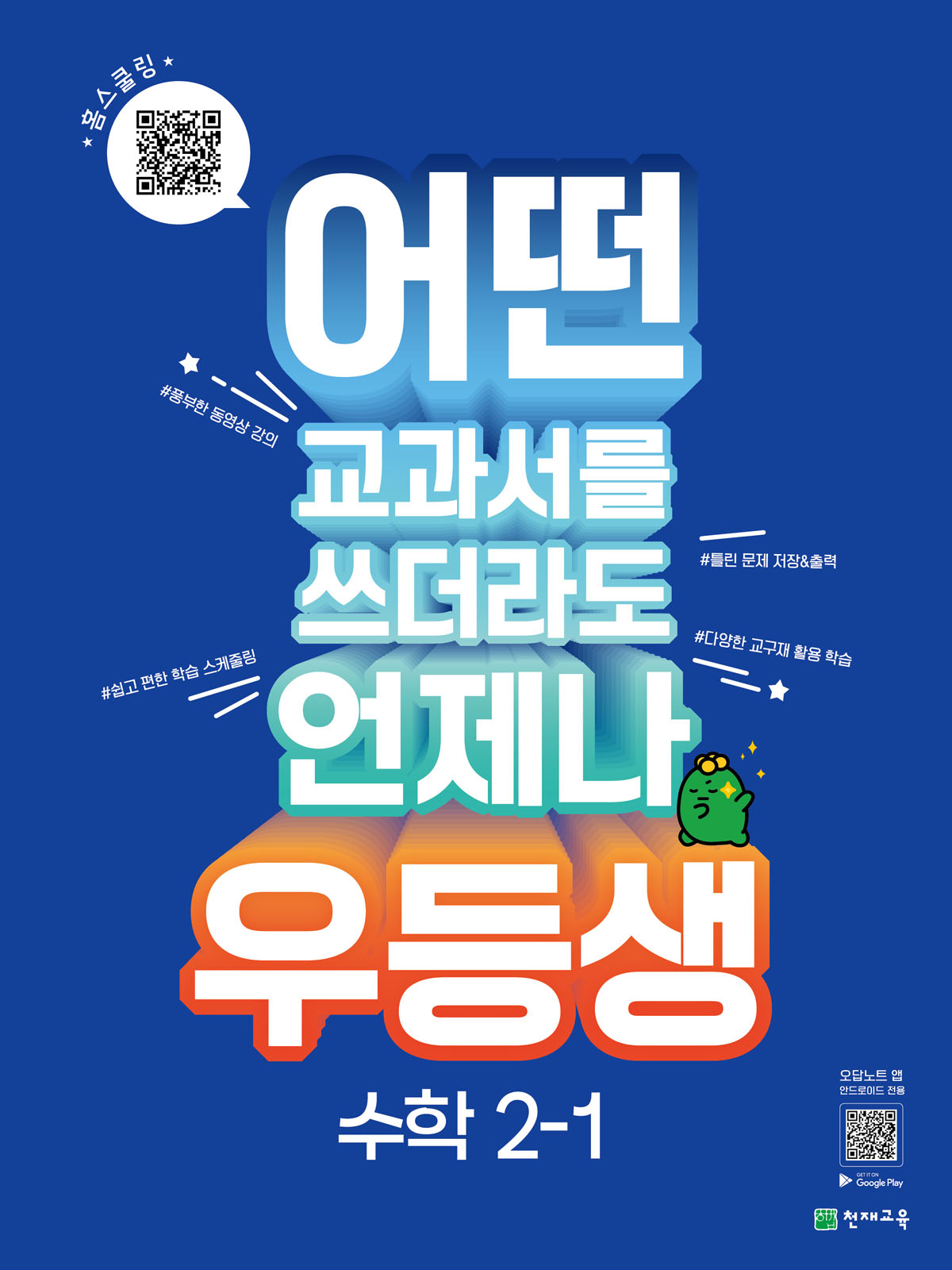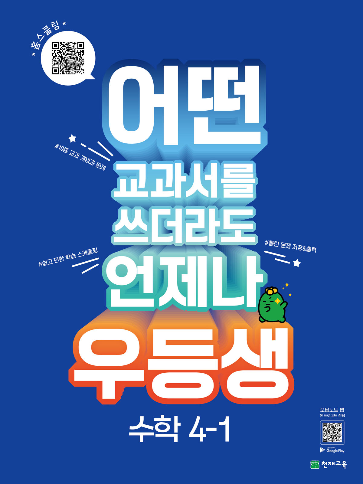 30여년 간의 초등 필수 교재로 자리 잡아온 천재교육 우등생 시리즈의 교육 경험과 노하우가 커다란 새 교과서 시장에 적합한 최적의 교재로 새롭게 태어났어요.