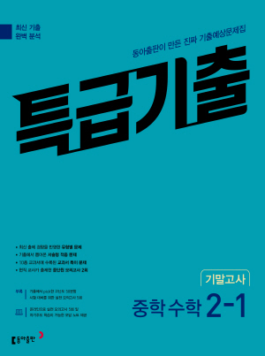 동아출판이 만든 진짜 기출문제집 『특급기출』 중학교 수학 시험을 완벽하게 대비하고 싶은 2~3학년 학생에게 추천 10종 교과서와 전국 1,000개 중학교 기출문제 완벽 분석, 출제율 높은 기출문제로 전체 문항 구성 현직 교사가 출제한 중단원 실전 모의고사를 포함해 시험 최적화되어 학습 할 수 있다.