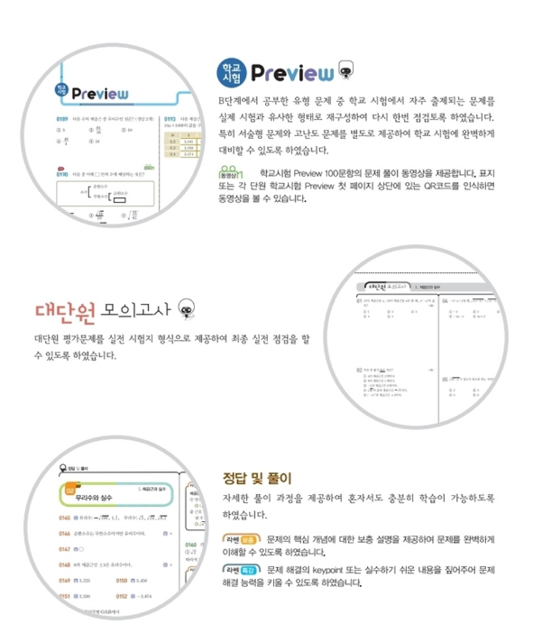 특히 각 단원의 끝부분에 있는 학교시험 preview는 내신 적중률이 높으며, 유형 training보다 난이도가 좀 더 높아서 학생들에게 세번씩은 풀게 합니다. QR코드로 문제 풀이 영상까지 제공이 되어서 혼자 공부하는 친구들도 충분히 내용을 숙지 할수 있습니다. 동영상 풀이는 각 문제마다 따로 들어가서 시청이 가능하도록 되어 있습니다.
