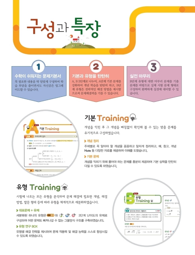 수학을 어려워하는 학생들이 어려운 개념과 문제로 학습 의욕이 꺾이지 않도록 출제 빈도가 낮은 어려운 문제를 적게 있고 기본 실력을 강화하고 유형별 학습을 통해 문제해결력을 향상시킬 수 있도록 만들어진 책 인 것 같아요
