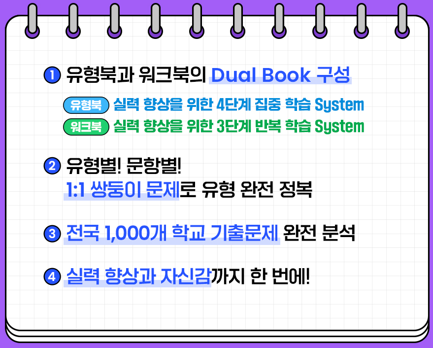 이미 연산으로 강해지는 수학 시리즈로 기초 계산력을 키운터라서 어렵지 않게 할 수 있을 것 같은데 내신와 실력을 모두 다잡기 위해서 꼭 필요한 유형만 모아 4단계 집중 학습할 수 있는 System을 갖추었다는 유형북과 3단계 반복 학습 형태로 진행되는 워크북 2권을 동시에 혹은 따로 따로 숙제와 기본 학습 프로그램으로 나누어 진행해도 좋을 것 같고 쌍둥이 문제로 구성한 수학 문제 기본서이기 때문에 내신 공부에 좋답니다.