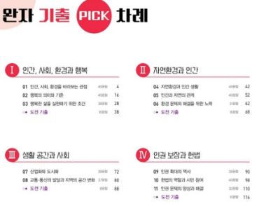 5) 통합사회 중간고사 대비를 위해 완자 기출 PICK 통합사회 1000제를 구매하였습니다. 아이 학교 통합교과 교과서가 비상출판사라 완자 시리즈로 구매를 하였고요. 완자 기출 PICK 통합사회 1000제는 다른 문제집에 비해 난이도가 있는 편이라 중간고사 및 기말고사 대비용으로 아주 좋은것 같습니다. 시험 준비에 많은 도움이 되었어요.
