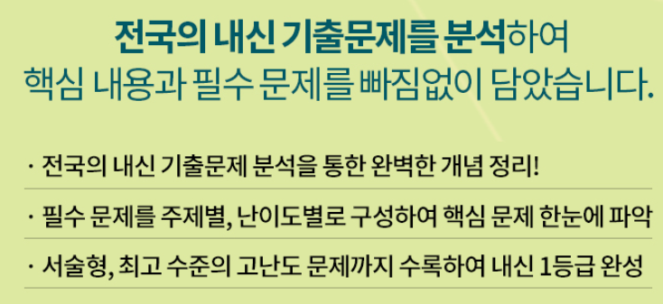 전국의 기출문제를 분석하여 핵심 내용과 필수 문제를 빠짐없이 담았다. 기출문제를 빈틈없이 분석하여 빈출 자료와 보기 선지로 개념을 새롭게 정리하였으며, 꼭 풀어봐야 할 필수 문제를 주제별로, 난이도별로 구성하여 한눈에 핵심 문제를 파악할 수 있다. 서술형, 최고 수준의 고난도 문제까지 한 번에 도전하여 내신 1등급을 완성한다.
