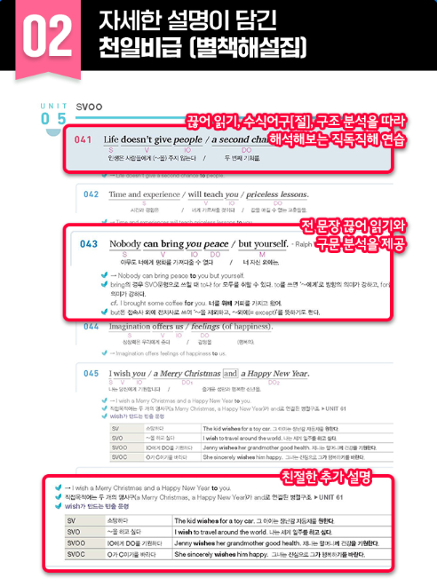 수능과 내신 뿐만 아니라, 공인영어, 공무원 시험 등의 시험에서 빈출되는 중요 구문들도 천일문을 통해 학습이 가능하다. 천일문으로 어떤 시험이든 좋은 결과를 얻길 바란다.