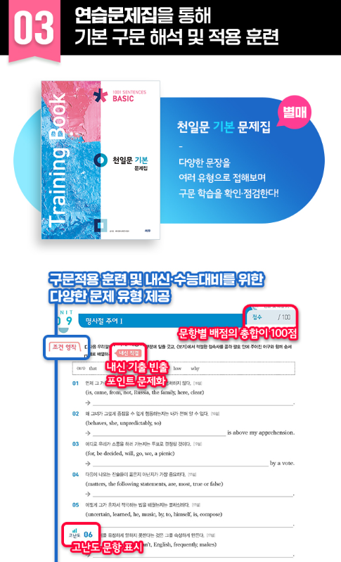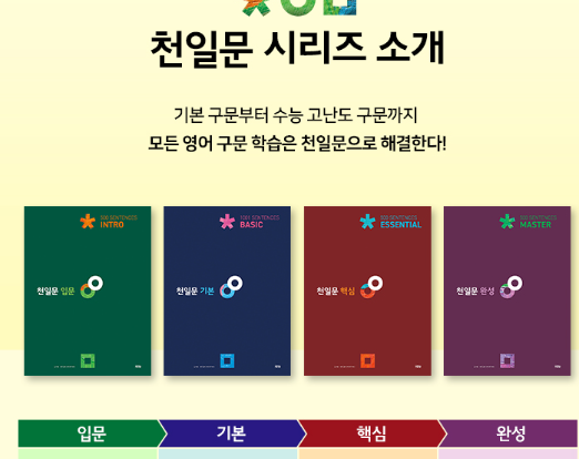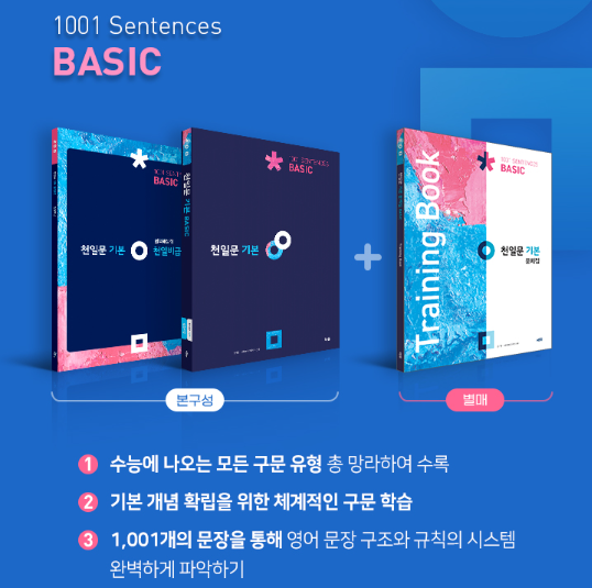 『천일문』은 대표 구문들을 끊어 읽으며 영어 구조를 익히는 것이 특징이며, 빠른 직독직해와 정확한 문장 해석을 할 수 있도록 했다. 『천일문 기본』은 체계적인 구문 개념 학습을 원하는 학생을 위해 제작되었다. 총 1,001개 문장으로 구성되어 있으며, 수능에 나오는 모든 구문의 유형을 총 망라하여 수록되어 있다. 전 문장 끊어 읽기와 구문 분석을 제공하고 있기 때문에 혼자서도 기초를 체계적으로 학습할 수 있다. 수능, 평가원 등 최신 기출 트렌드를 반영했으며, 어법 직결/영작 직결/문장 전환 등의 문제도 수록하였다.