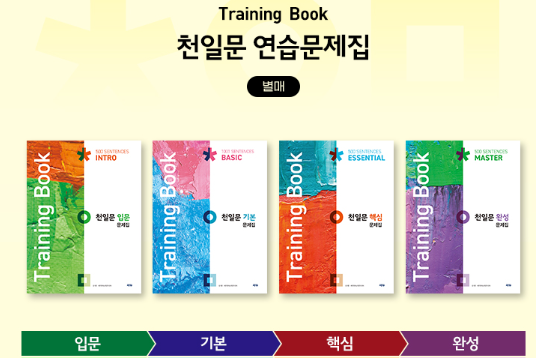 별도로 판매하고 있는 ‘천일문 기본 문제집(Training Book)’은 구문적용 훈련 및 내신 대비를 위해 다양한 유형의 문제를 제공하고 있다. 고등 독해를 위한 기본기를 다지고 싶다면 ‘천일문 기본 문제집(Training Book)’으로 꼭 복습하길 추천한다.