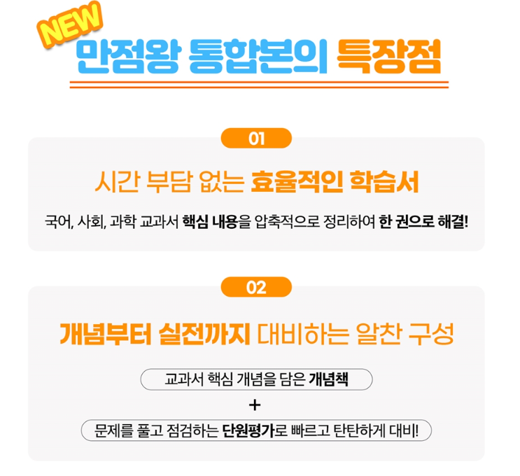 수학문제집은 다른 문제집으로 하기 때문에 EBS 만점왕 시리즈에서 국어·사회·과학 묶여 있는 교재가 필요했는데, EBS 초등 만점왕 통합본 국어·사회·과학가 아주 딱이어서 고민 없이 주문했습니다. 숙제할 시간도 없는데, 국어, 사회, 과학은 소홀히할 수 없어서 고민하던 찰나에 나타난 아주 적합한 교재라서 만족합니다.