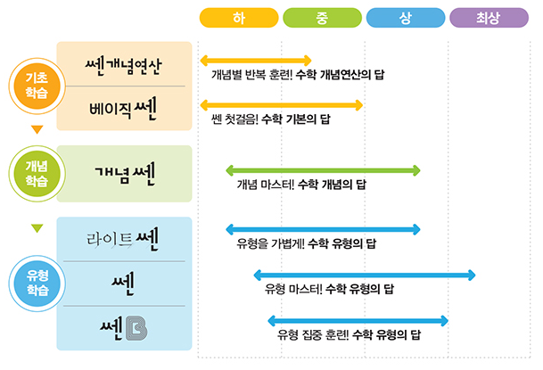 그래서 학생들과 부모님들께서 쎈수학을 사러 갔는데 종류가 너무 많아서 어떤 책을 사야 학생 수준에 맞을지 물어보시는 경우가 참 많습니다.